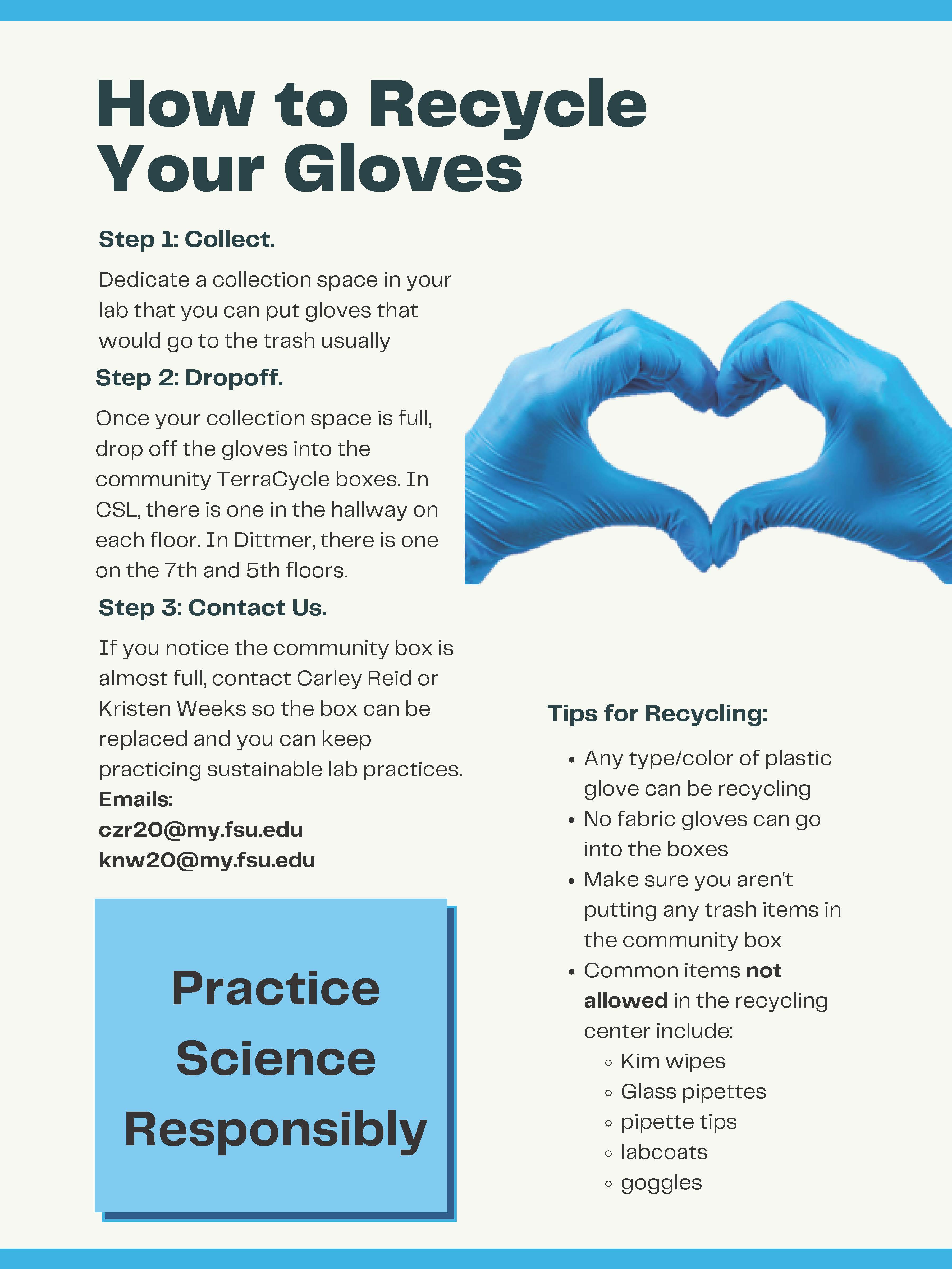 Through the support of an FSU Green Fund Project Grant, the Chemistry & Biochemistry Department has enacted the first glove-recycling program at FSU. In laboratory settings, single use plastics are a necessity for safety and sterility. However, their use results in approximately 5.5 million tons of plastic lab waste annually (Urbina et al., 2015).
