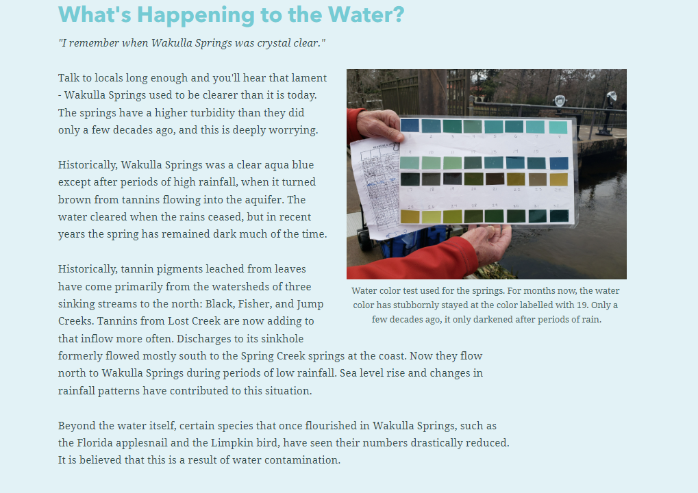 “I think Lauren did a great job of digging into what is special about Wakulla and some of the challenges it’s facing right now,” said Haley. “How Lauren was able to integrate the information we threw at her, understand it, and then present it in a way that other people can understand – kudos to her because you wouldn’t know that she didn’t come from a science background by looking at the Story Map!”