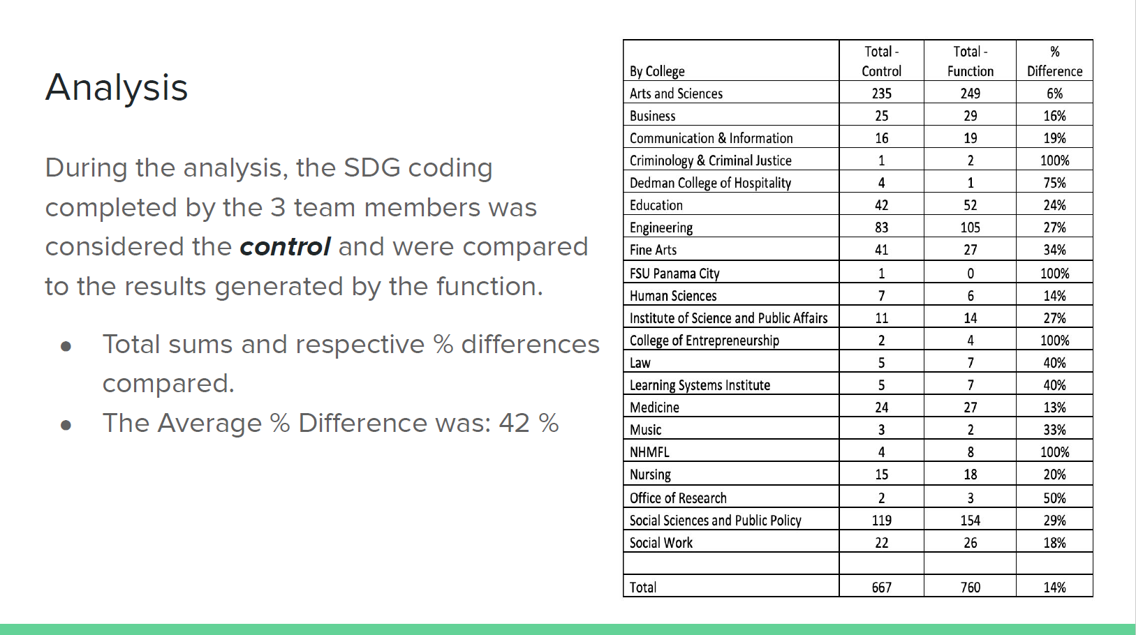 Over the next eight weeks, the team divided the list of researchers and courses and individually categorized their selections by the SDGs. Finally, the team undertook an analysis of their findings, creating summary graphs and charts and comparing their results to an automated formula that had been designed to automatically categorize researchers and courses by SDG using a database of key words. The automated formula produced the same results as the team 79% of the time. Additional research and formula validation will be undertaken to address the 21% of variation from the human coders in future semesters.