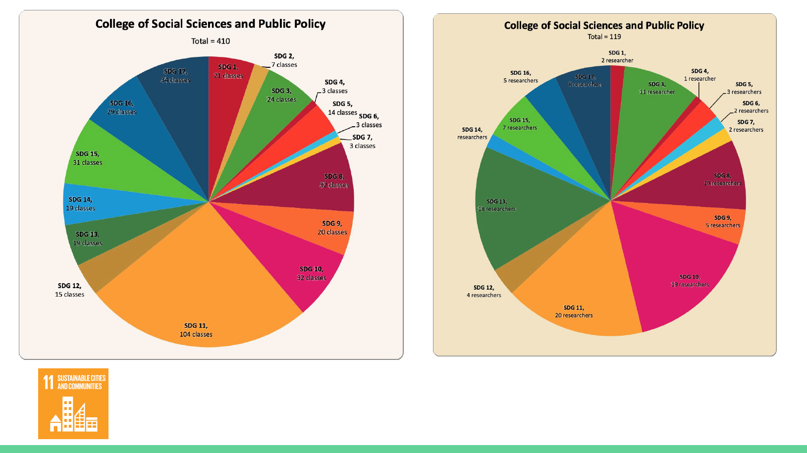 Overall, the team found that FSU sustainability courses were most likely to address SDG 11, SDG 16, and SDG 8 while FSU sustainability researchers were most likely to address SDG 13, SDG 11, and SDG 10. In addition, the team was able to show the distribution of SDGs in each FSU college through a series of pie charts. Finally, the team identified the College of Social Sciences and Public Policy and the College of Arts and Sciences as the highest performing in terms of courses and researchers that align with the SDGs.