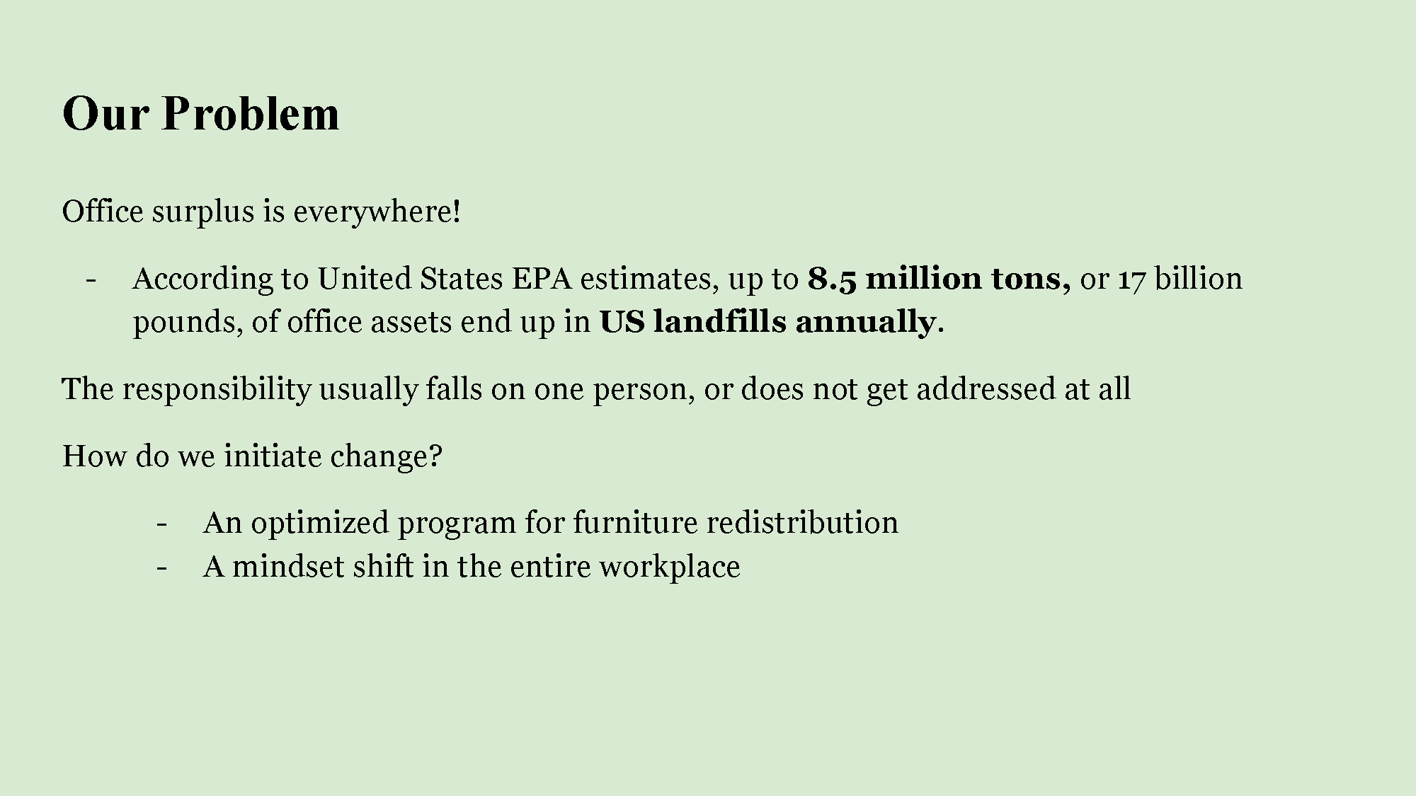 Throughout her project, Carly encountered challenges stemming from the scarcity of relevant data and the specificity of workplace scenarios. However, these challenges also paved the way for future opportunities, such as the potential development of a "Green Office Certification Program." This envisioned program could take after Sustainable Campus’ Green Office Program and include a point-based system encouraging the utilization of donated furniture alongside donations.