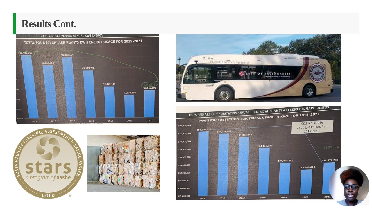 FSU's sustainability endeavors encompass remarkable achievements, including substantial energy optimization and reduction, the daily recycling of 2,000 lbs. of cardboard, the complete electrification of FSU buses, a reduction in CO2 consumption, and proactive efforts to combat food waste while addressing food insecurity.