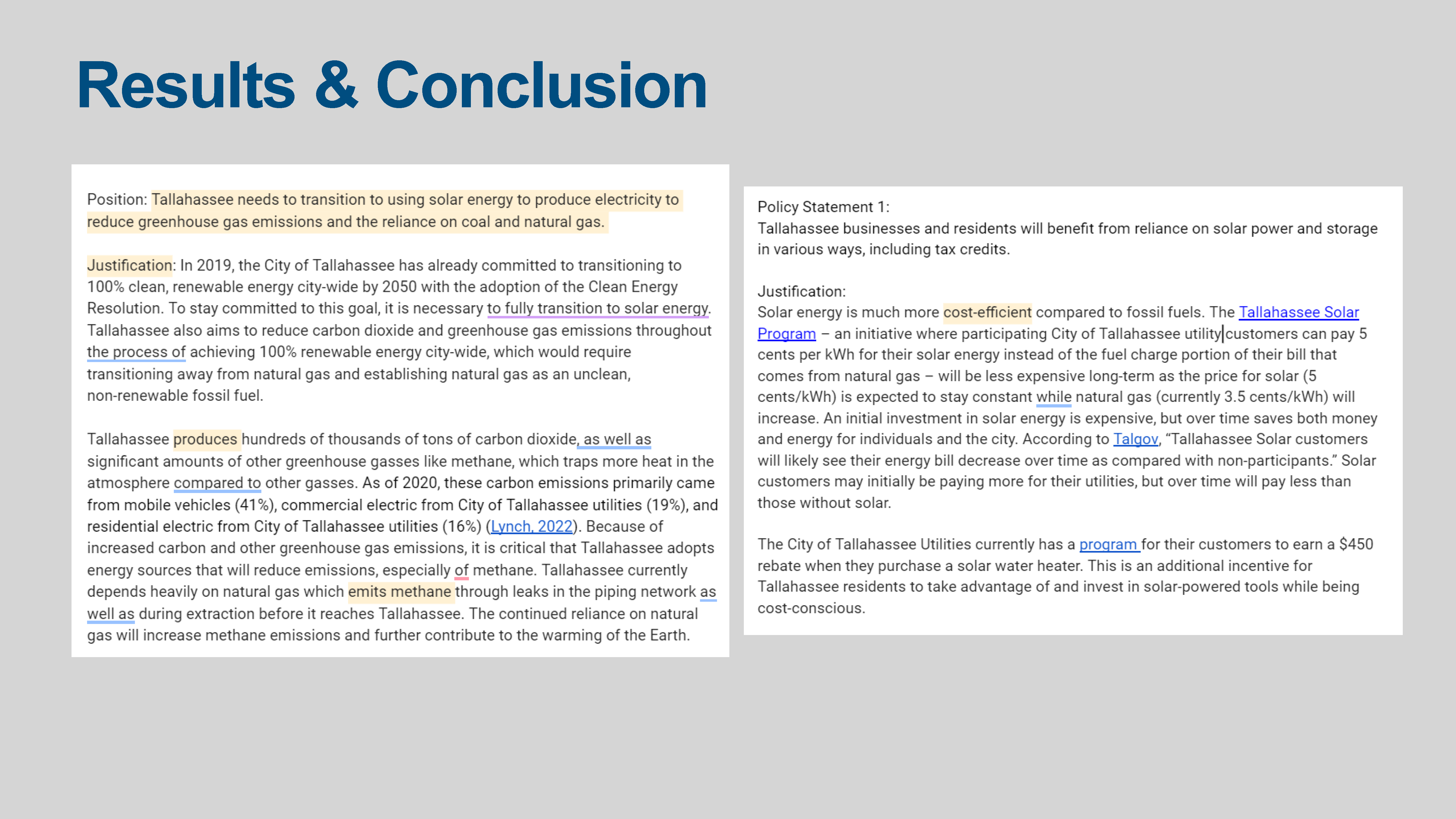 Nia's Fellowship project goal was to produce position statements on Solar Energy and Storage—a project with the potential to drive awareness and inspire action within the community. By engaging in meticulous research, analyzing Tallahassee-specific initiatives, and studying successful models from other cities, Nia worked with Shawn Youngblood and Sustainable Tallahassee's board members and committees to craft statements.