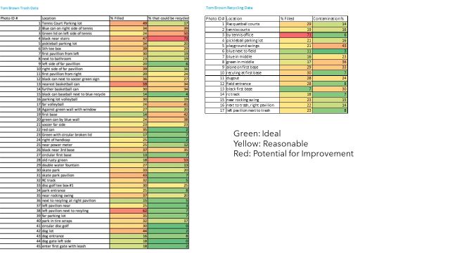 Connor's data table showing his analysis of 45 trash cans and 17 recycling bins at Tom Brown Park